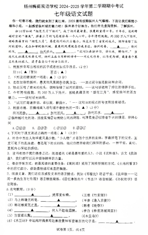 江苏100教学资源网 七下 江苏省扬州市邗江区梅苑双语学校2024-2025学年七年级下学期期中考试语文试卷(无答案) https://www.jiangsu100.com/31913.html