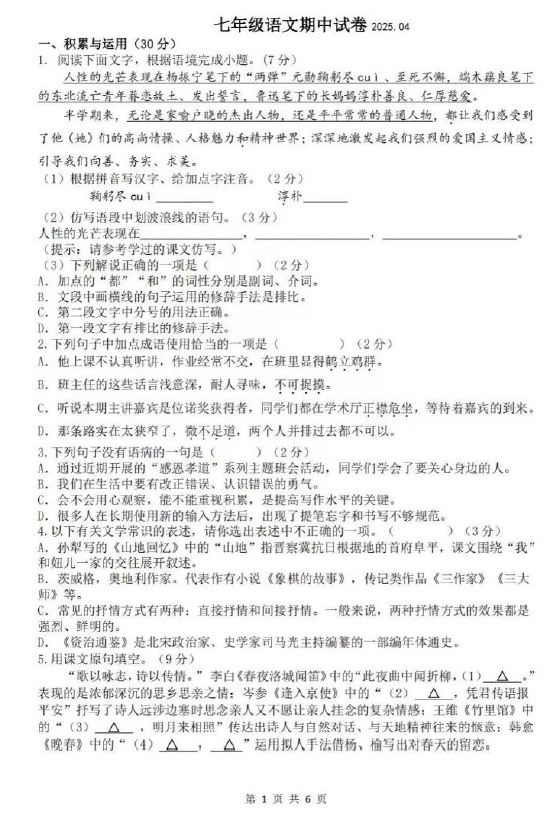 江苏100教学资源网 七下 江苏省扬州市邗江区实验学校2024-2025学年七年级下学期期中考试语文试卷(含答案) https://www.jiangsu100.com/31916.html