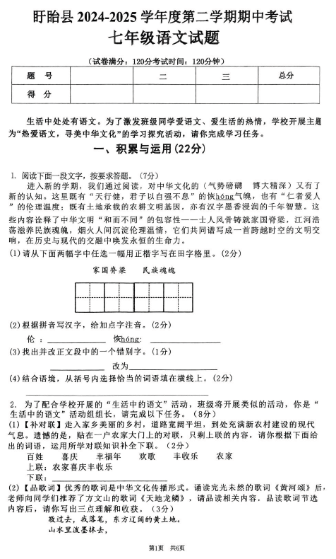 江苏100教学资源网 七下 江苏省淮安市盱眙县2024-2025学年七年级下学期4月期中语文试题(含答案) https://www.jiangsu100.com/31943.html