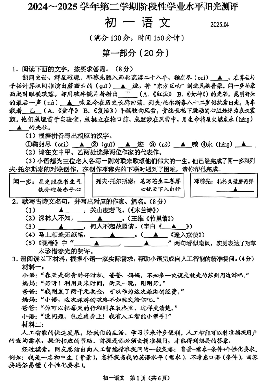 江苏100教学资源网 七下 江苏省苏州市昆山、太仓、常熟、张家港市2024-2025学年第二学期七年级语文期中阳光测评卷(含答案) https://www.jiangsu100.com/31963.html