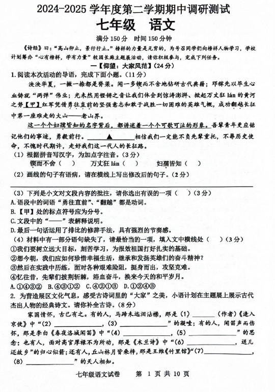 江苏100教学资源网 七下 江苏省宿迁市宿城区2024-2025学年七年级下学期4月期中语文试题(含答案) https://www.jiangsu100.com/31982.html
