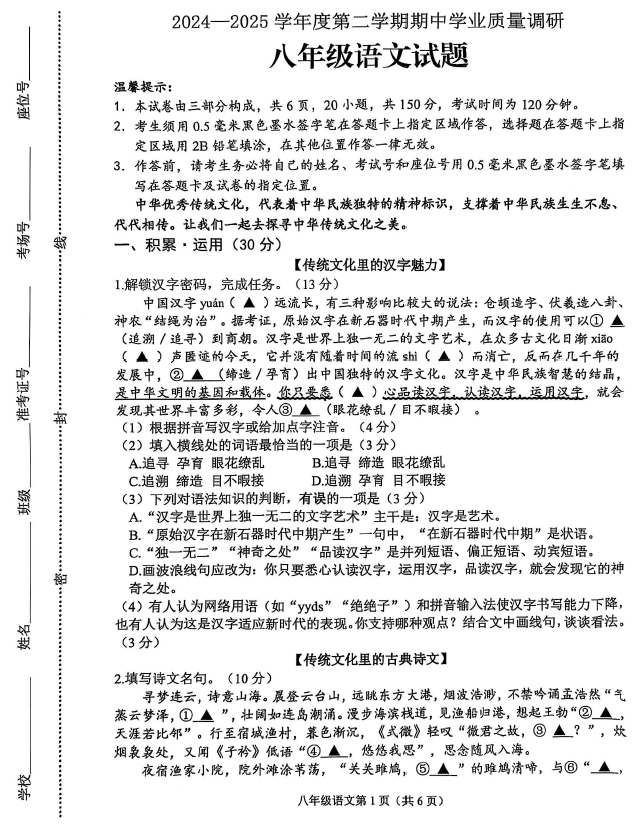 江苏100教学资源网 八下 江苏省连云港海州区2024-2025学年八年级下学期期中学业质量调研语文试题(无答案) https://www.jiangsu100.com/32088.html