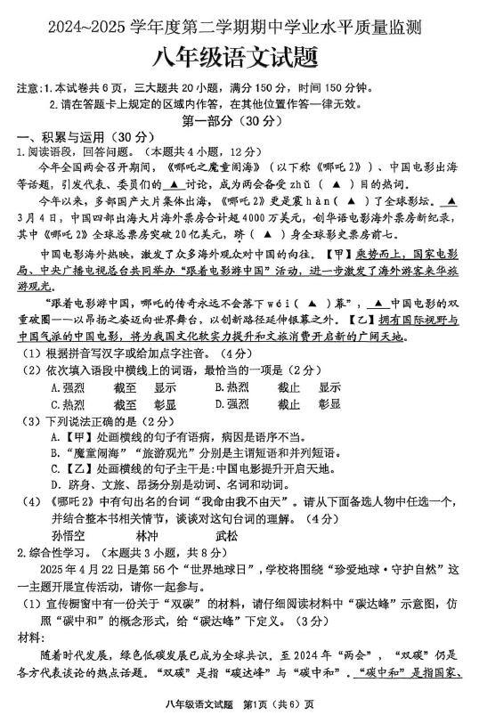 江苏100教学资源网 八下 江苏省连云港市赣榆区2024-2025学年八年级下学期期中考试语文试卷(无答案) https://www.jiangsu100.com/32094.html