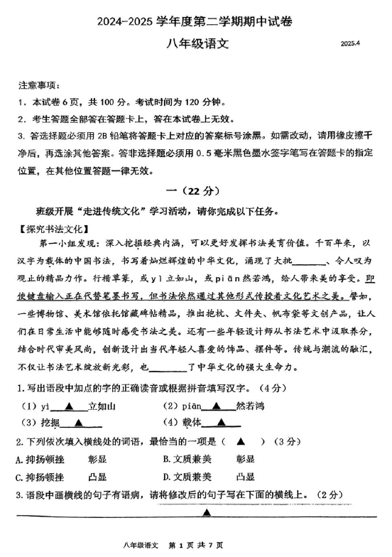 江苏100教学资源网 八下 江苏省南京市鼓楼区部分学校2024-2025学年八年级下学期期中考试语文试卷(无答案) https://www.jiangsu100.com/32103.html