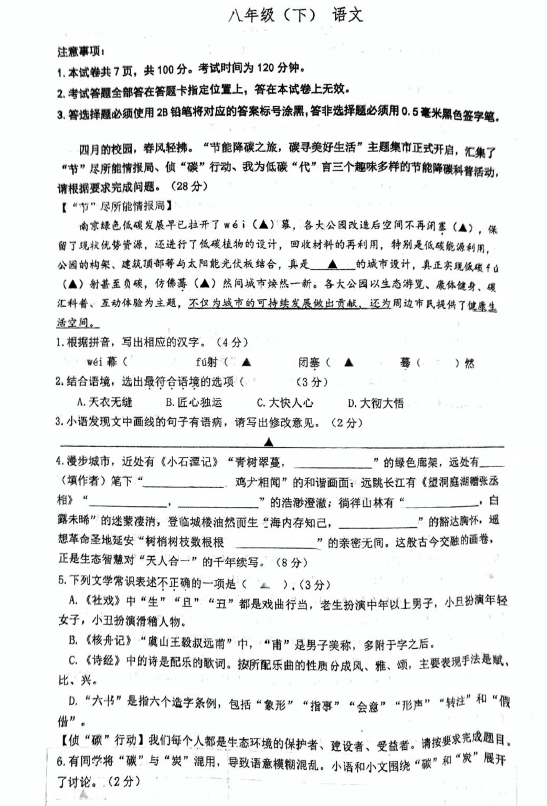 江苏100教学资源网 八下 江苏省南京市鼓楼区南京师范大学附属中学树人学校2024-2025学年八年级下学期期中考试语文试题(无答案) https://www.jiangsu100.com/32106.html