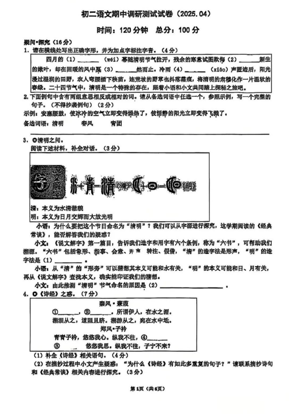 江苏100教学资源网 八下 江苏省南京市建邺区南京师范大学附属中学新城初级中学2024-2025学年八年级下学期期中考试语文试题(无答案) https://www.jiangsu100.com/32136.html