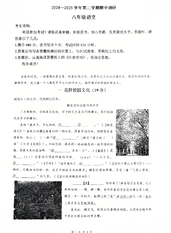 江苏100教学资源网 八下 江苏省南京市金陵中学河西分校2024-2025学年八年级下学期期中考试语文试题(无答案) https://www.jiangsu100.com/32139.html