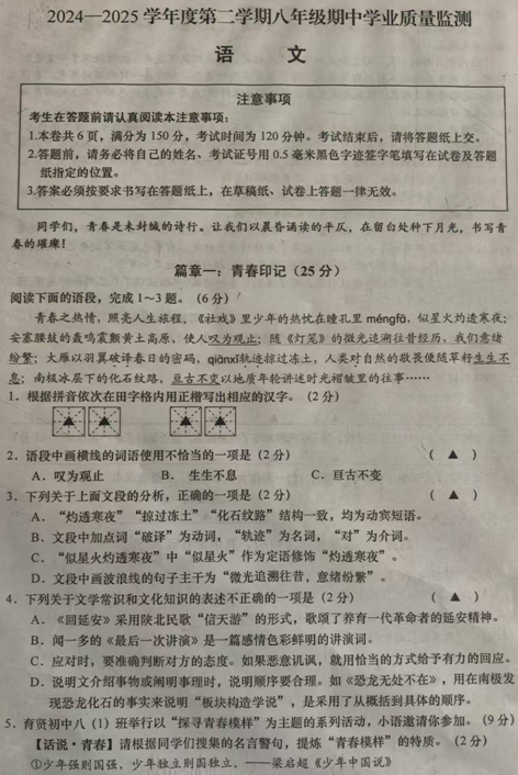江苏100教学资源网 八下 江苏省南通市如皋市2024-2025学年八年级下学期4月期中考试语文试题(含答案) https://www.jiangsu100.com/32156.html