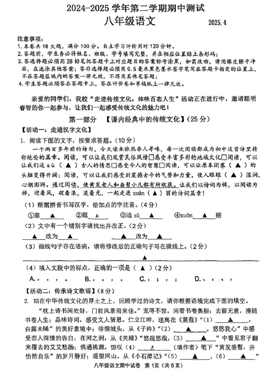 江苏100教学资源网 八下 江苏省苏州市草桥中学校2024-2025学年八年级下学期4月期中语文试题(无答案) https://www.jiangsu100.com/32159.html