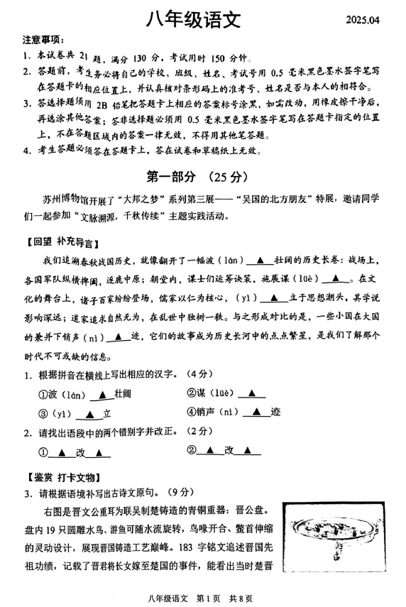 江苏100教学资源网 八下 江苏省苏州市吴中区2024-2025学年八年级下学期期中考试语文试题(无答案) https://www.jiangsu100.com/32168.html