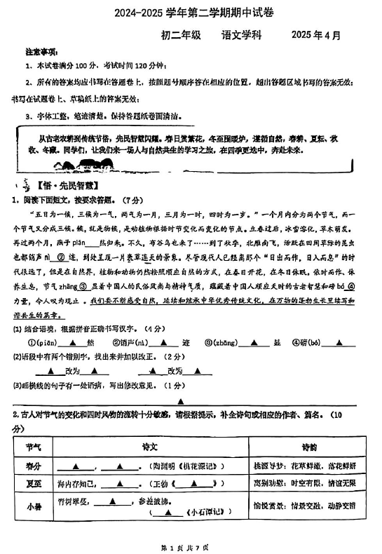 江苏100教学资源网 八下 江苏省苏州园区青剑湖实验中学2024-2025学年八年级下学期期中语文卷(无答案) https://www.jiangsu100.com/32171.html