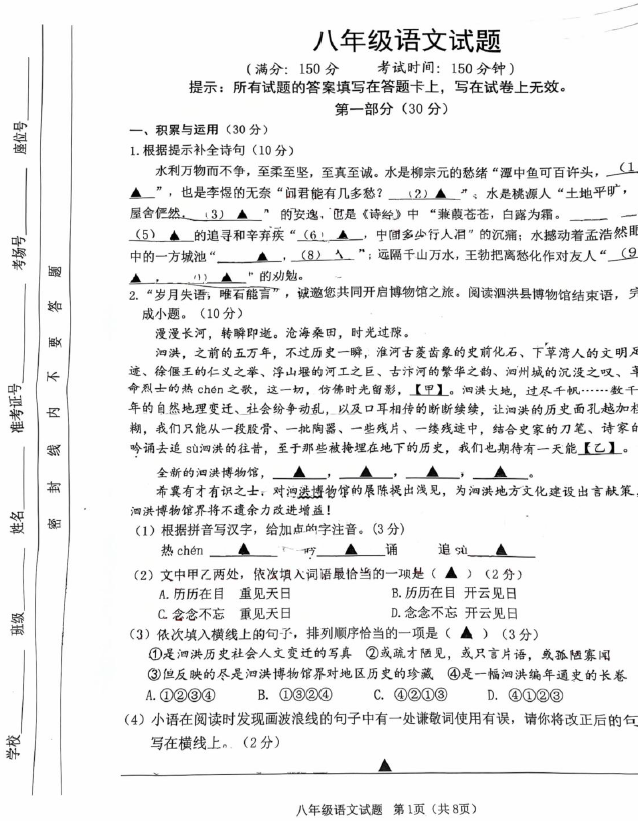 江苏100教学资源网 八下 江苏省宿迁市泗洪县2024-2025学年八年级下学期4月期中语文试题(含答案) https://www.jiangsu100.com/32174.html