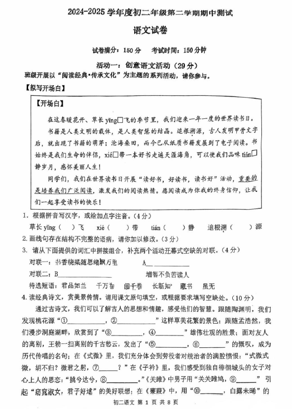 江苏100教学资源网 八下 江苏省宿迁市苏州外国语学校2024-2025学年八年级下学期期中考试语文试题(无答案) https://www.jiangsu100.com/32177.html