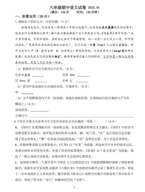 江苏100教学资源网 八下 江苏省扬州市邗江实验学校2024—2025学年八年级下学期期中考试语文试卷(无答案) https://www.jiangsu100.com/32196.html