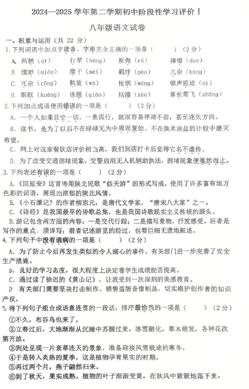 - 江苏省扬州市江都区2024-2025学年八年级下学期期中语文试题(含解析) 2026-04-19