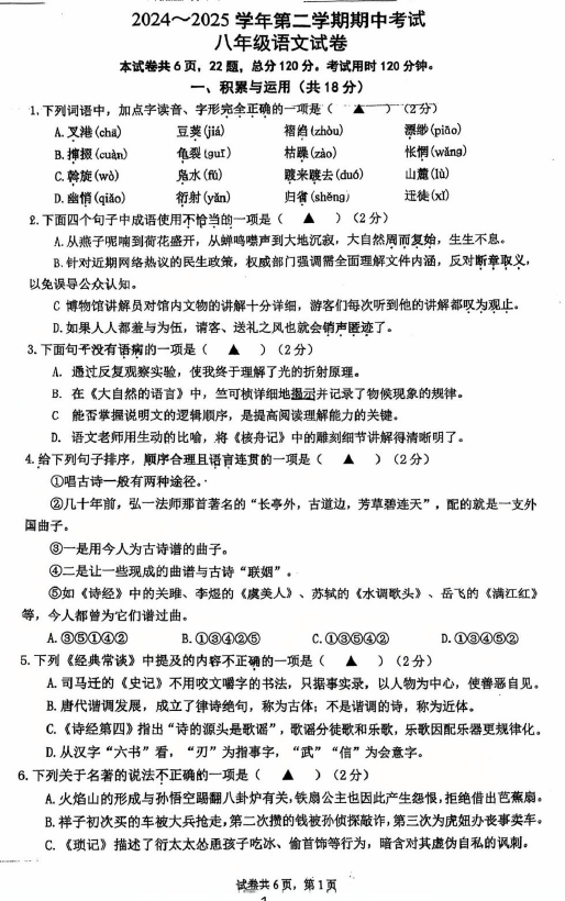 江苏100教学资源网 八下 江苏省镇江市市属学校2024—2025学年八年级下学期期中考试语文试卷(无答案) https://www.jiangsu100.com/32204.html