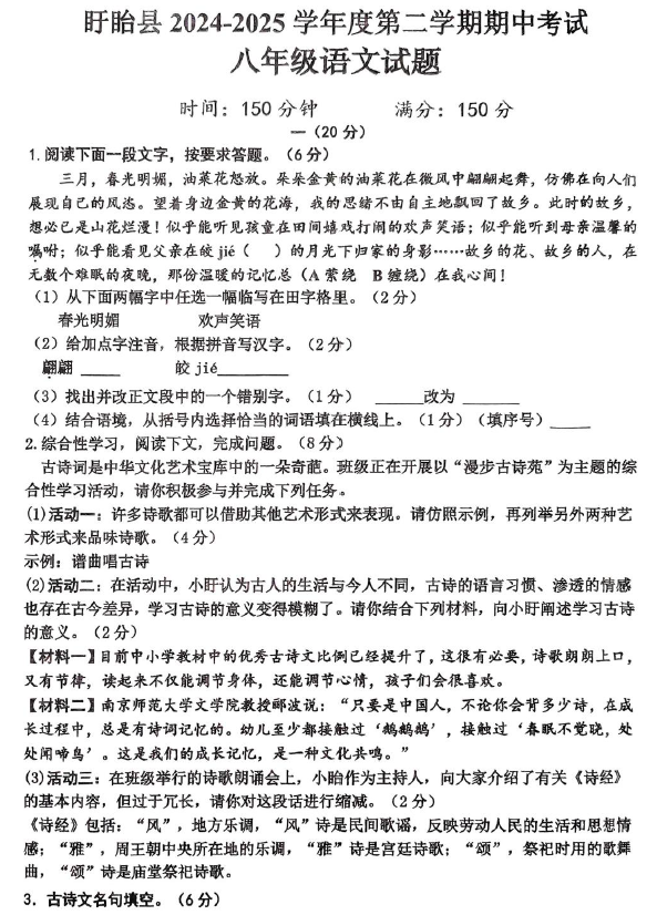江苏100教学资源网 八下 江苏省淮安市盱眙县2024-2025学年八年级下学期4月期中语文试题(含答案) https://www.jiangsu100.com/32213.html