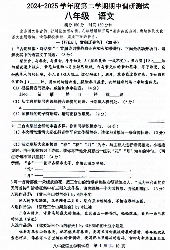 江苏100教学资源网 八下 江苏省宿迁市宿城区2024-2025学年八年级下学期4月期中语文试题(含答案) https://www.jiangsu100.com/32242.html