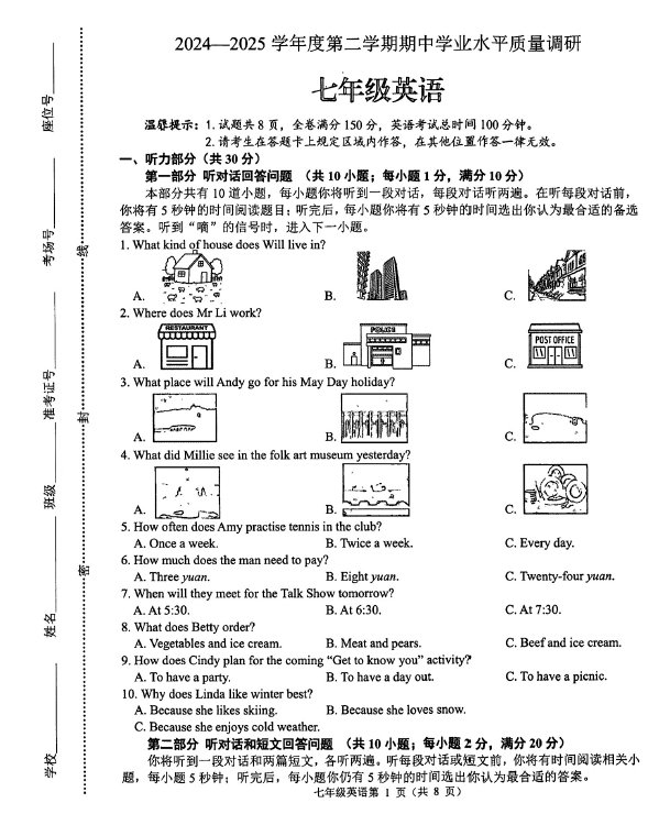 江苏100教学资源网 七下 江苏省连云港海州区2024-2025学年七年级下学期期中考试英语试卷(含答案) https://www.jiangsu100.com/32347.html
