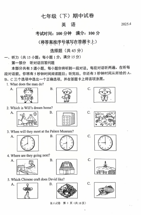 江苏100教学资源网 七下 江苏省南京民办求真中学2024-2025学年七年级下学期期中考试英语试卷(无答案) https://www.jiangsu100.com/32350.html
