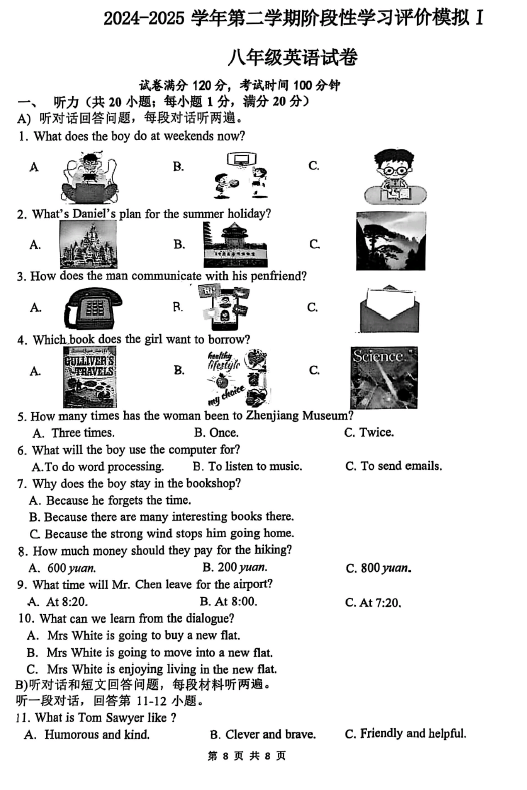 江苏100教学资源网 八下 江苏省镇江市外国语学校2024~2025学年八年级下学期期中模拟考试英语试卷(无答案) https://www.jiangsu100.com/32639.html
