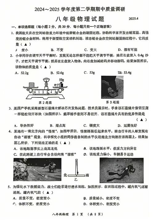 - 江苏省南通市通州区2024-2025学年八年级下学期4月期中物理试题(含答案) 2026-04-20