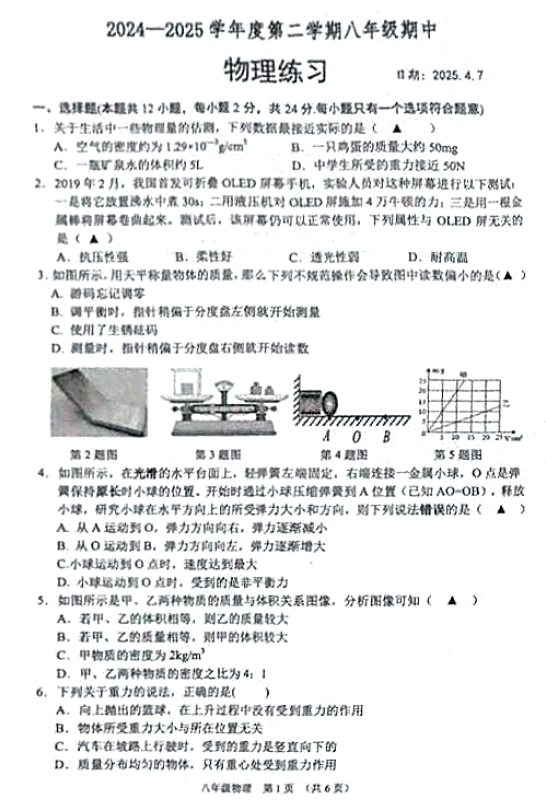 江苏100教学资源网 八下 江苏省宿迁市沭阳县怀文中学2024-2025学年八年级下学期4月期中物理试题(含答案) https://www.jiangsu100.com/32980.html