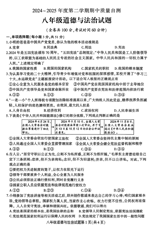 江苏100教学资源网 八下 江苏省徐州市铜山区2024-2025学年八年级下学期期中质量自测道德与法治试题(含答案) https://www.jiangsu100.com/33319.html