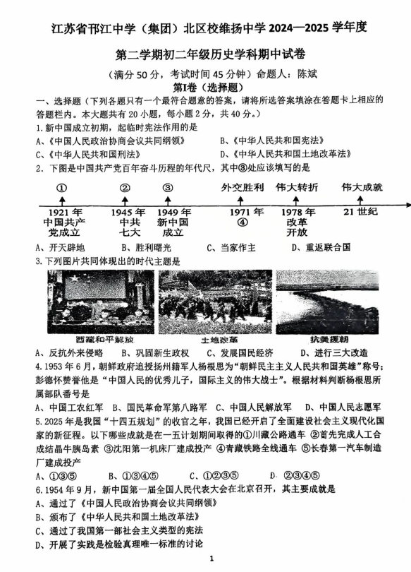 江苏100教学资源网 八下 江苏省扬州市邗江区维扬中学2024-2025学年八年级下学期历史期中考试试卷(无答案) https://www.jiangsu100.com/33603.html