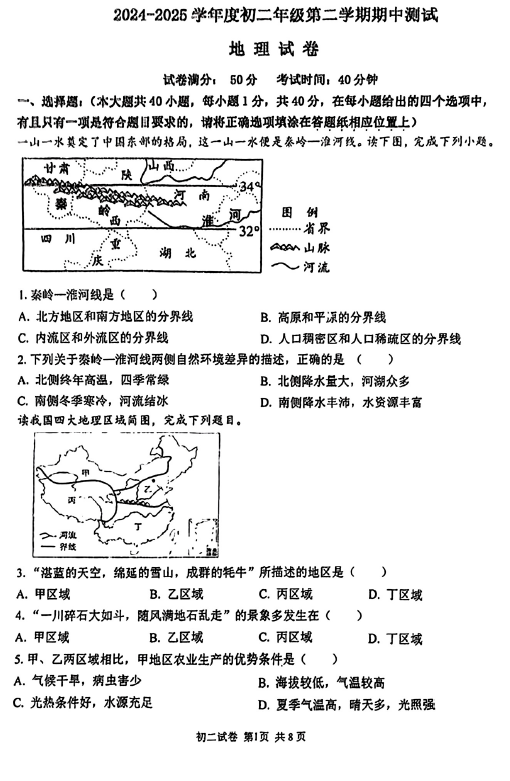 江苏100教学资源网 八下 江苏省宿迁市经济技术开发区2024-2025学年八年级下学期期中地理试卷(无答案) https://www.jiangsu100.com/33845.html