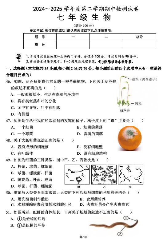 江苏100教学资源网 七下 江苏省淮安市盱眙县2024-2025学年七年级下学期期中考试生物试题(无答案) https://www.jiangsu100.com/33943.html