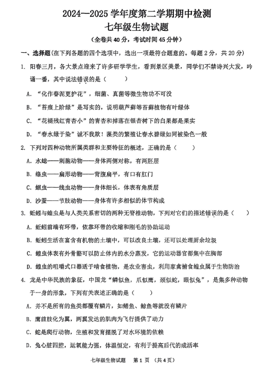 江苏100教学资源网 七下 江苏省徐州市2024—2025学年七年级下学期期中检测生物试题(含答案) https://www.jiangsu100.com/34003.html