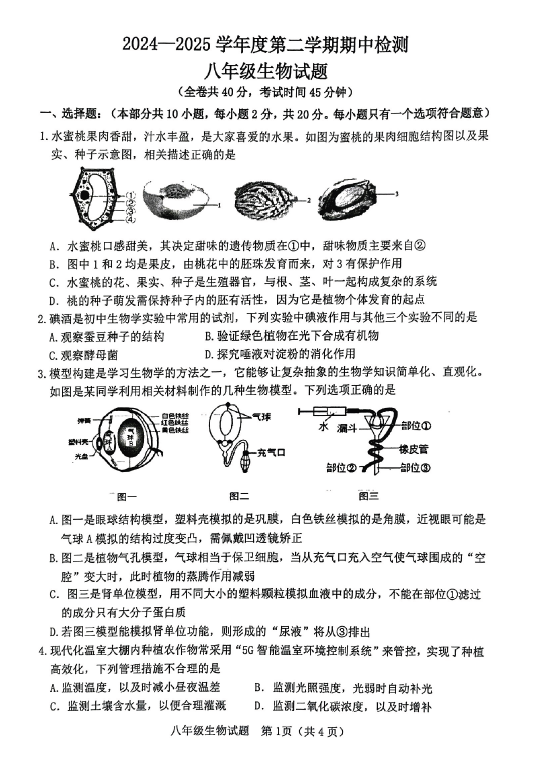 江苏100教学资源网 八下 江苏省徐州市2024-2025学年八年级下学期期中考试生物试题(含答案) https://www.jiangsu100.com/34112.html