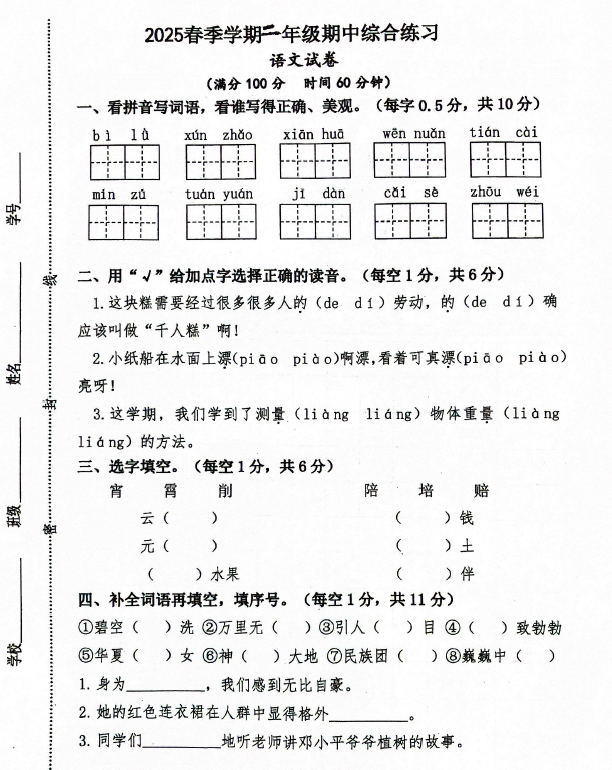 江苏100教学资源网 二下 江苏省宿迁市宿城区古城中心小学、屠园中心小学、中扬中心小学2024-2025学年二年级下学期4月期中语文试题(含答案) https://www.jiangsu100.com/34618.html