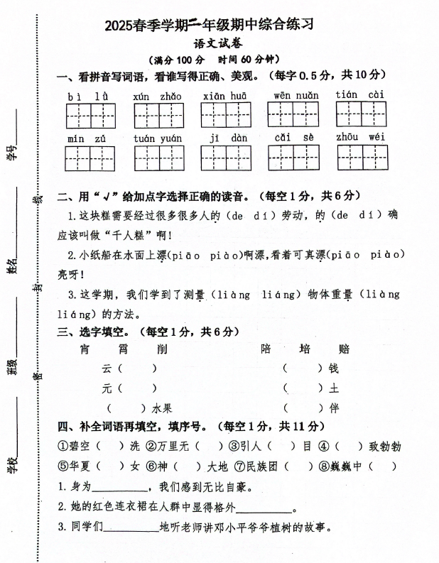 江苏100教学资源网 二下 江苏省宿迁市宿城区古城中心小学、屠园中心小学、中扬中心小学2024-2025学年二年级下学期4月期中语文试题(含答案) https://www.jiangsu100.com/34666.html