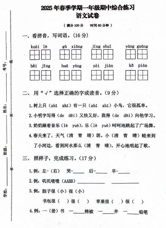 江苏100教学资源网 一下 江苏省宿迁市宿城区古城中心小学、屠园中心小学、中扬中心小学2024-2025学年一年级下学期4月期中语文试题(含答案) https://www.jiangsu100.com/34699.html