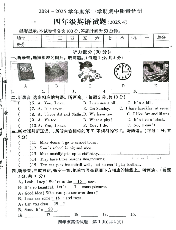 江苏100教学资源网 四下 江苏省徐州市沛县2024-2025学年四年级下学期4月期中英语试题(含答案) https://www.jiangsu100.com/34814.html