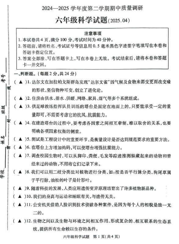 江苏100教学资源网 六下 江苏省徐州市沛县2024-2025学年六年级下学期4月期中科学试题(含答案) https://www.jiangsu100.com/34892.html