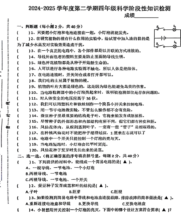 - 江苏省徐州市沛县2024-2025学年四年级下学期期中科学试卷(无答案) 2026-04-27