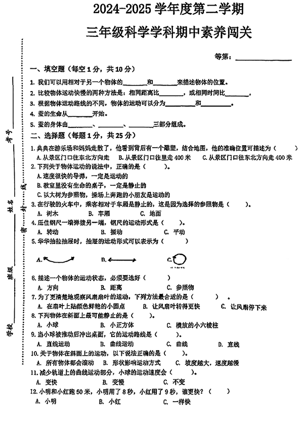 江苏100教学资源网 三下 江苏省徐州市睢宁县实验小学2024-2025学年三年级下学期期中科学试题(无答案) https://www.jiangsu100.com/34915.html