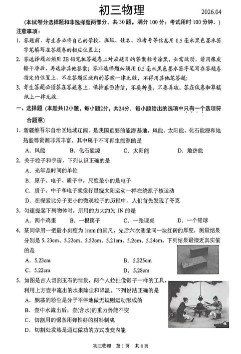 江苏100教学资源网 九下 2025-2026学年江苏省苏州市吴中、吴江、相城中考一模物理试题(无答案) https://www.jiangsu100.com/34930.html