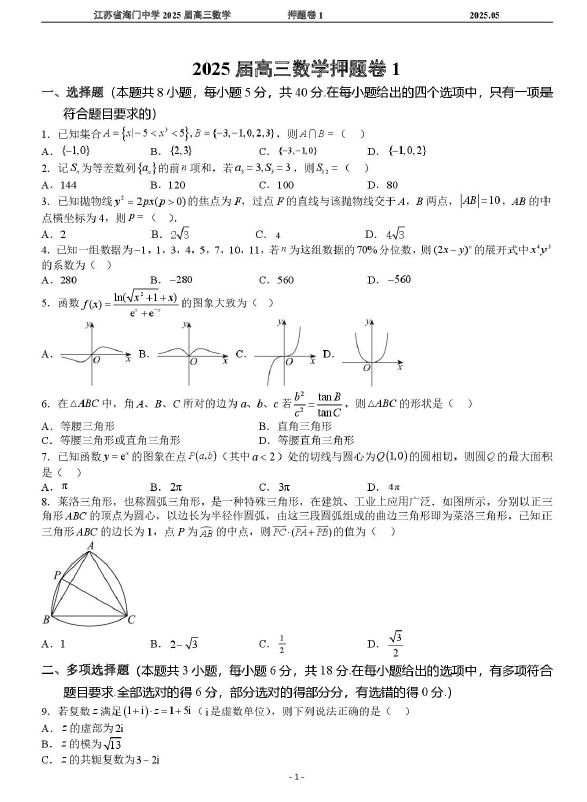 江苏100教学资源网 高三下 2025届江苏省南通市海门中学高三高考押题卷1数学试题(含解析) https://www.jiangsu100.com/34994.html