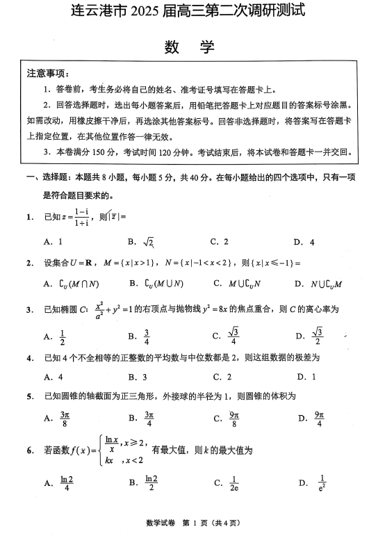 - 江苏省南通、徐州、扬州、淮安、泰州、宿迁、连云港七市2025届高三第二次调研测试数学试题(含答案) 2026-04-28