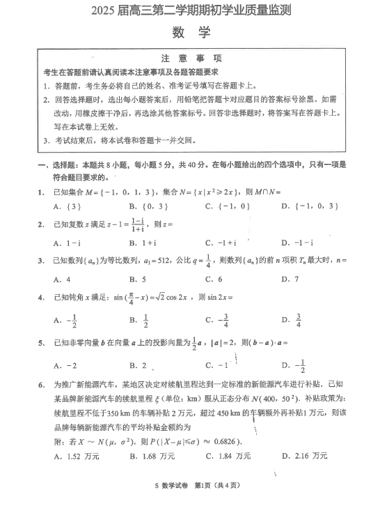 - 江苏省南通市2025届高三第一次调研测试数学试题(南通一模)(含解析) 2026-04-28