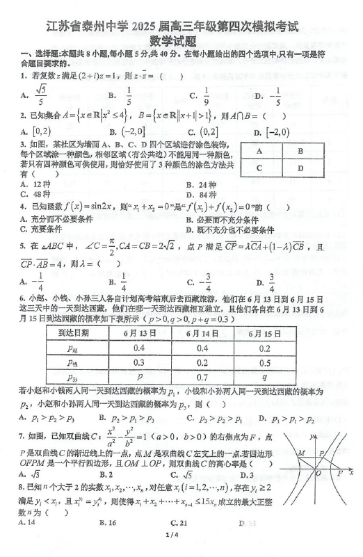 江苏100教学资源网 高三下 江苏省泰州中学2025届高三第四次模拟考试数学试题(含答案) https://www.jiangsu100.com/35080.html