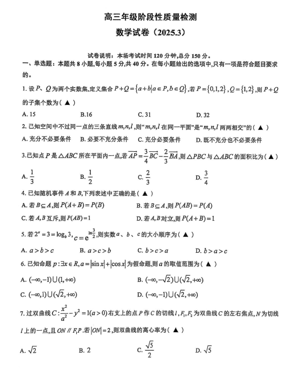 江苏100教学资源网 高三下 江苏省盐城市盐城中学2024-2025学年高三下学期3月阶段性质量检测数学试题(含答案) https://www.jiangsu100.com/35108.html