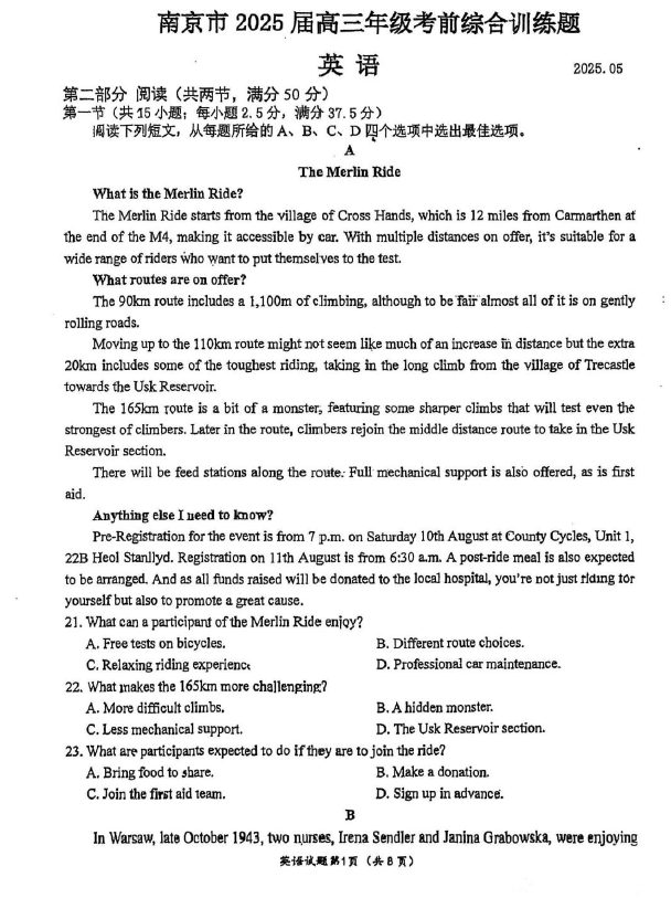 江苏100教学资源网 高三下 2025届江苏省南京市高三下学期考前综合训练英语试题(含答案) https://www.jiangsu100.com/35575.html