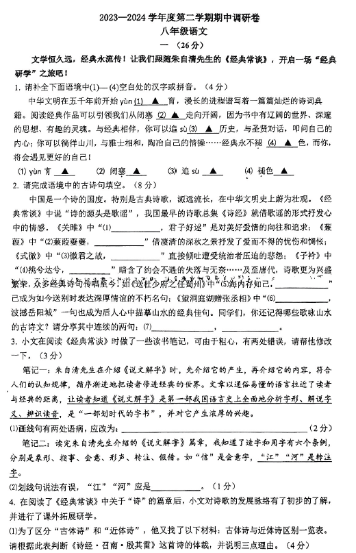江苏100教学资源网 八下 江苏省南京市鼓楼区多校联考2023-2024学年八年级下学期期中考试语文试题(PDF版含答案) https://www.jiangsu100.com/3873.html