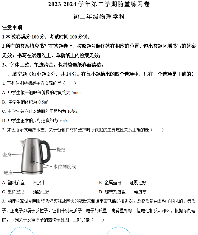 江苏100教学资源网 八下 江苏省苏州市西安交通大学苏州附属初级中学2023-2024学年八年级下学期5月随堂练习物理试题(带解析) https://www.jiangsu100.com/4631.html