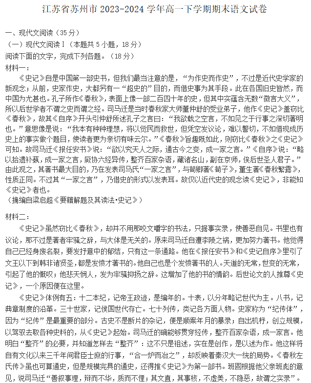 江苏100教学资源网 高一下 江苏省苏州市2023-2024学年高一下学期期末语文试卷(含解析) https://www.jiangsu100.com/8461.html